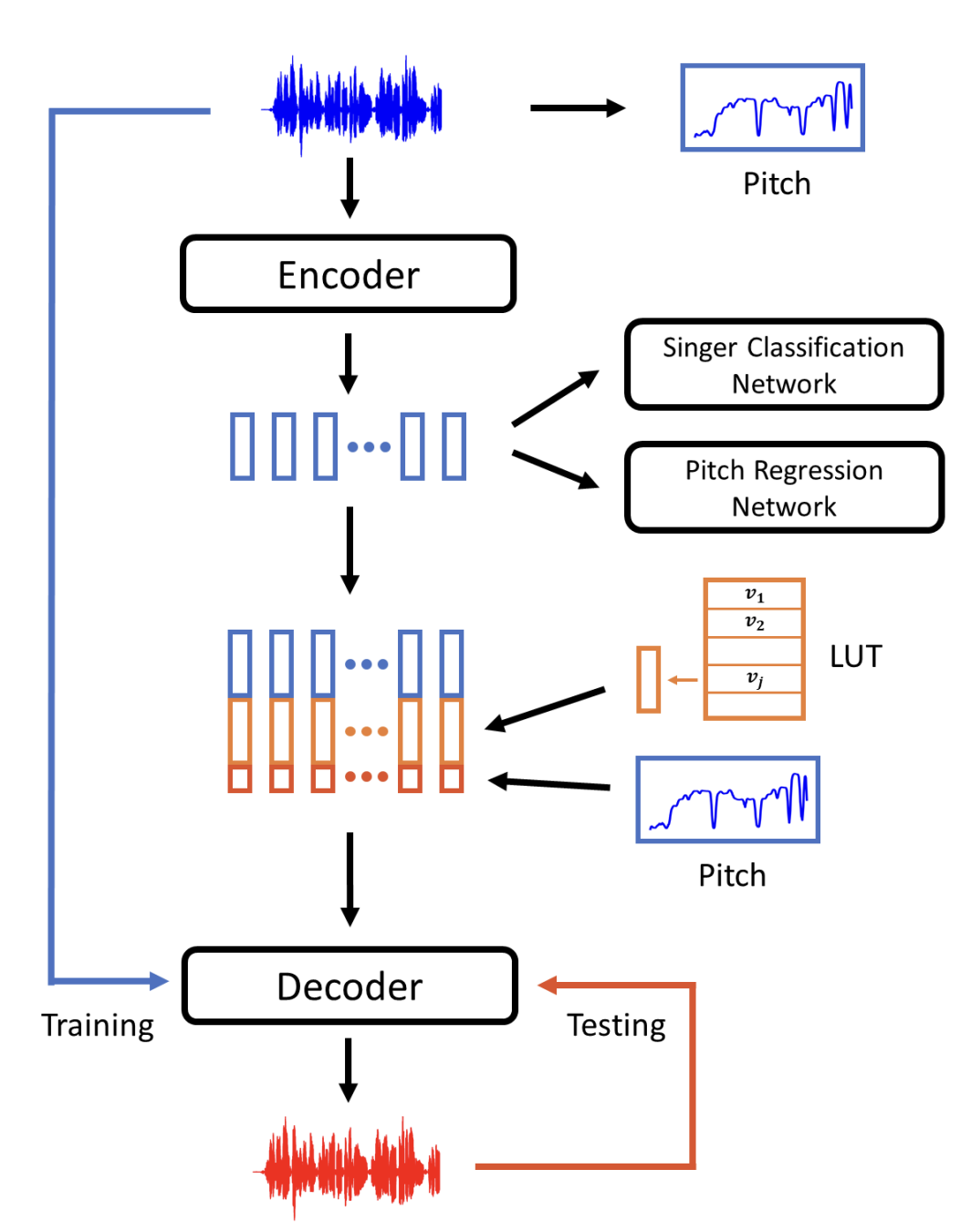 본 실험의 모델구조는 다음과 같고, pitch regression network만 적용해서 음성 변경을 시도했다. LUT는 Look Up Table의 약자로 변경 대상이 되는 음성의 임베딩 벡터가 된다.