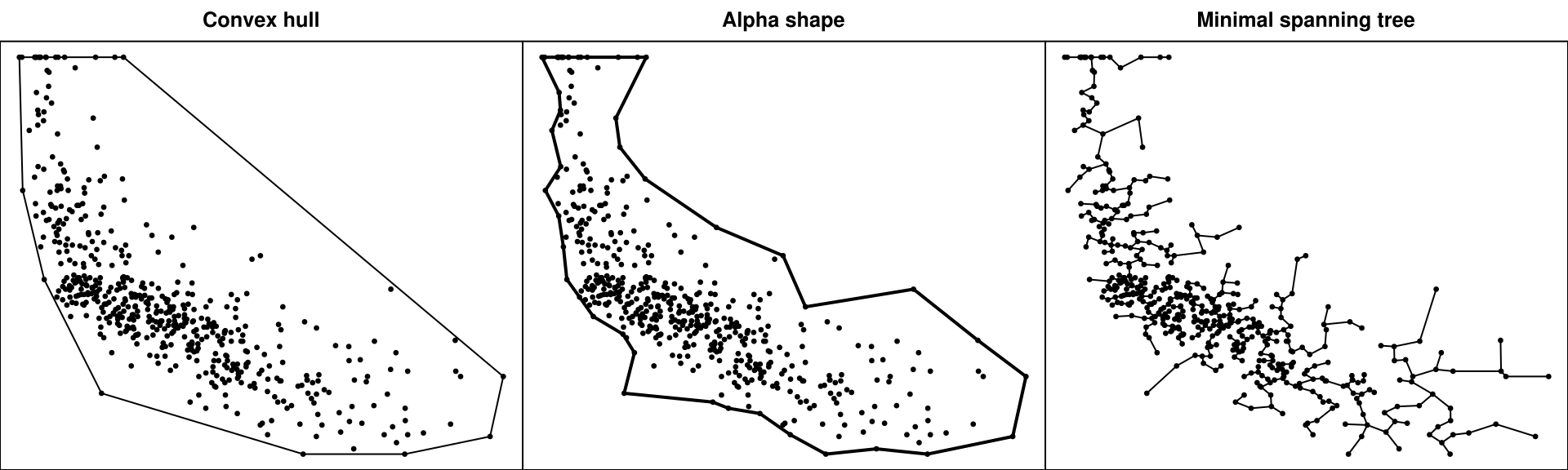 아래 그림의 중앙에 Alpha shape로 나타나는 모양이 concave hull(polygon)과 같은 이미지이다.