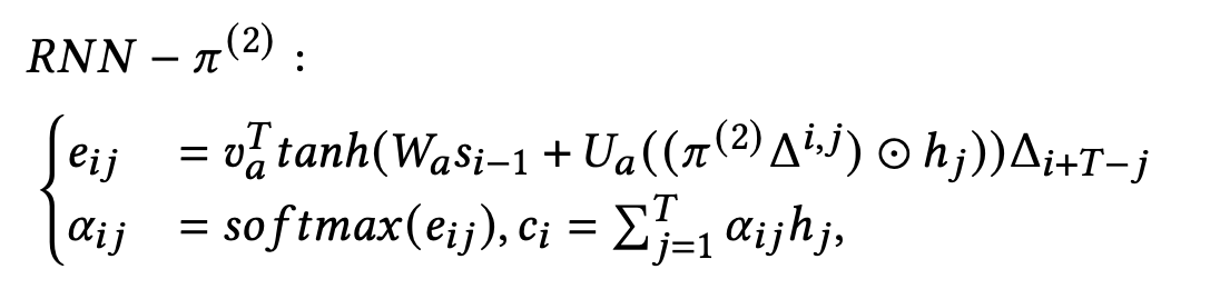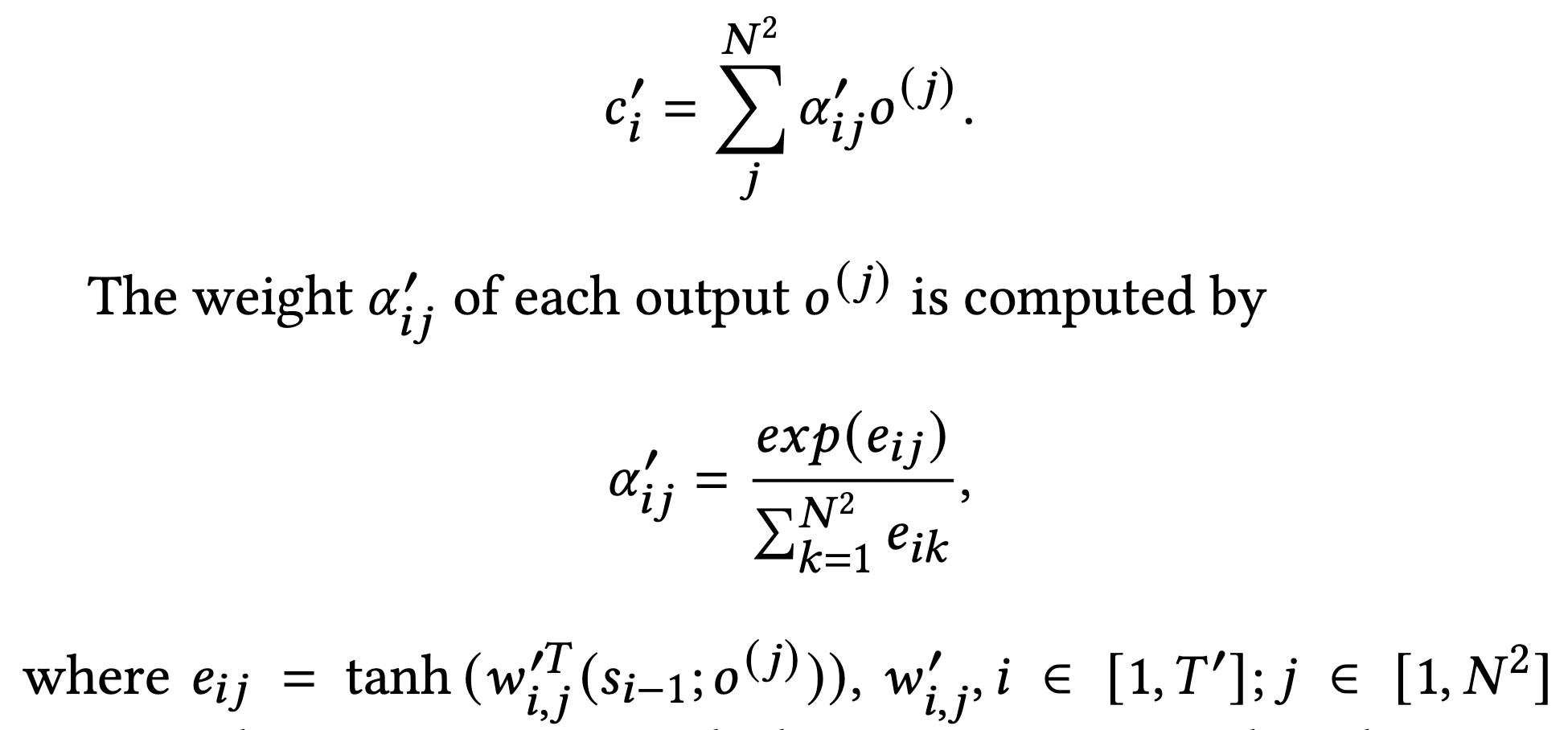 위 식에 나온 기호 중 추가 설명이 필요한 부분은 i, j, T`, T, h_j, s_(i-1)인데, T는 # of Encoder timesteps, T`는 # of Decoder timesteps, i는 Decoder time step index로 Decoder LSTM cell의 인덱스(1 <= i <= T`)이고, j는 Encoder의 time step index(1 <= j <= T)이고, h_j는 CNNLSTM의 output인 j번째 hidden state이고, s_(i-1)은 Decoder LSTM cell의 i-1번째 hidden state이다.