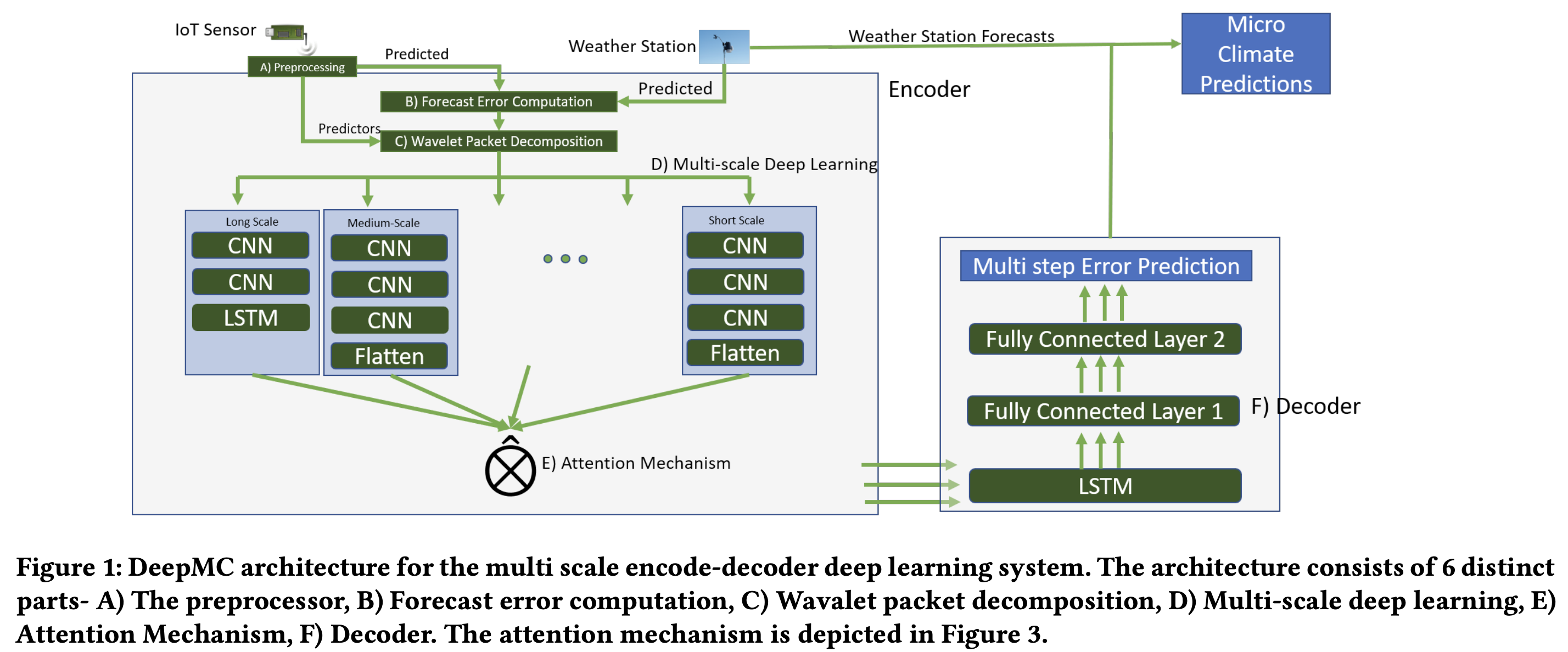 D) Multi-scale Deep Learning에서 다중 스케일로 encoding 된 데이터를 attention mechanism을 이용해 Decoder에 입력할 context vector(c)를 계산하는 과정이다.