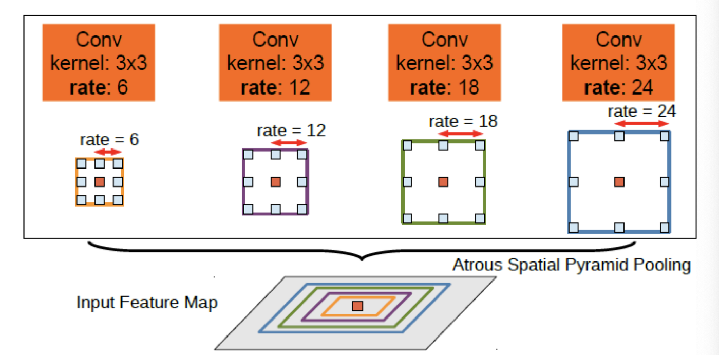 ASPP 는 SPP와 다르게 max pooling이 없기 때문에 입력과 출력의 크기가 같으며, 해상도가 낮아지지 않는다.
