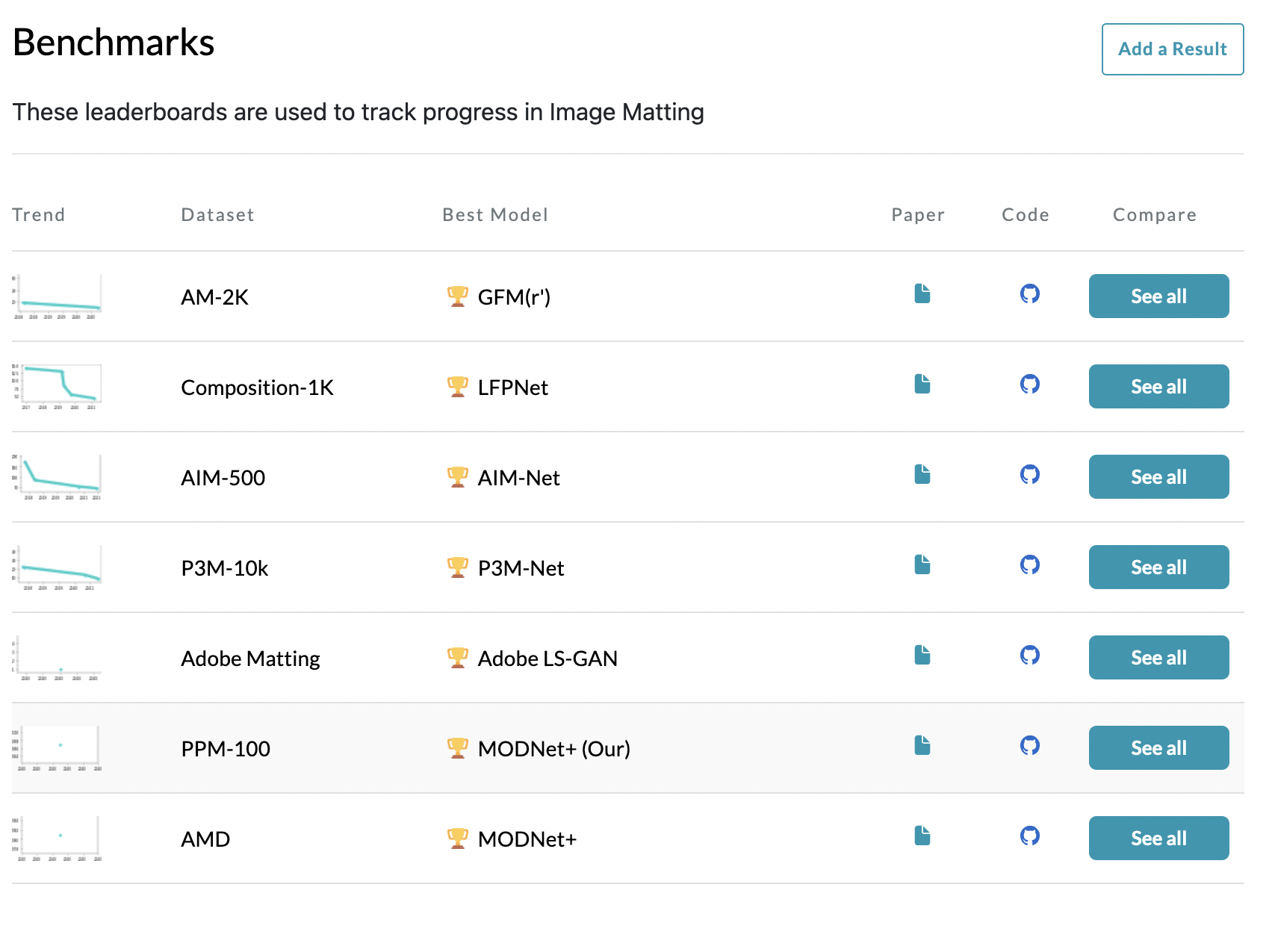 Image matting분야에서 SOTA(State Of The Art)알고리즘에 대해 찾아 봤는데, 데이터셋의 갯수는 많은데 모델의 갯수는 생각보다 적었다.