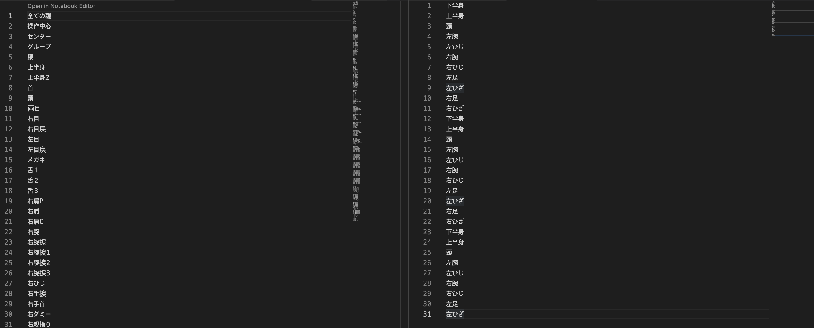 왼쪽의 잘 작동되는 모션의 경우 프레임당 100개가 넘는 bone들이 존재하고 각자의 좌표들이 존재하는데, 오른쪽의 변환한 모션의 경우 프레임당 11개 정도 bone밖에 없다.